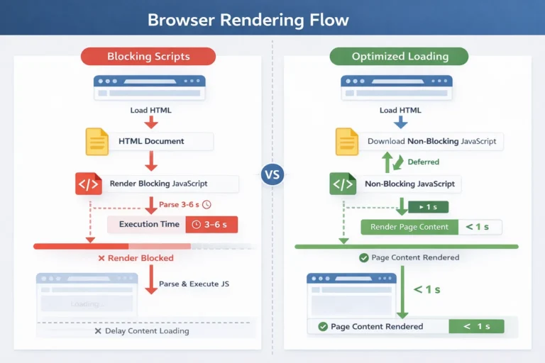 JavaScript can slow down a website when large scripts take longer to download, parse, and execute in the browser. Heavy or render-blocking JavaScript may delay page rendering and affect loading performance. Optimizing and minimizing JavaScript helps reduce these delays and improves web speed optimization.